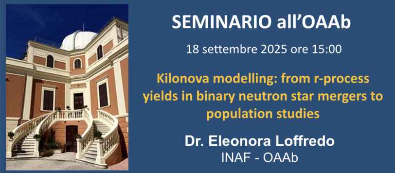 Giovedì 18 settembre aprile alle ore 15:00, la Dott.ssa Eleonora Loffredo, dell’INAF-Osservatorio Astronomico d’Abruzzo, terrà il seminario dal titolo “Kilonova modelling: from r-process yields in binary neutron star mergers to population studies”. Abstract: Binary neutron star (BNS) mergers eject neutron-rich matter, providing ideal conditions for the nucleosynthesis of heavy elements via the r-process. The radioactive […]