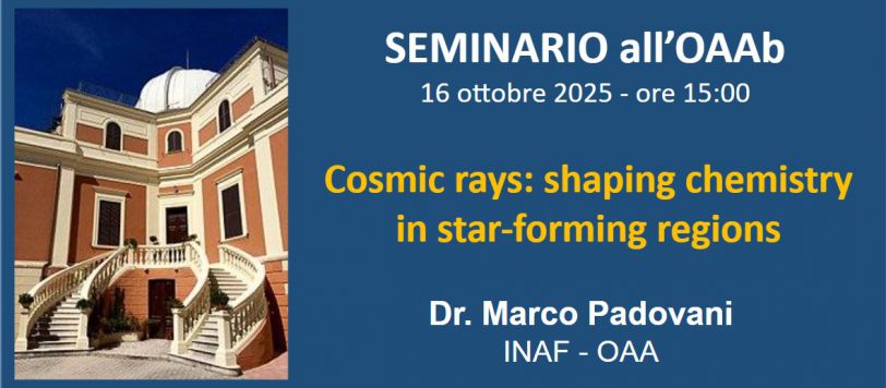 Giovedì 16 ottobre alle ore 15:00, il Dott. Marco Padovani, dell’INAF-Osservatorio Astrofisico di Arcetri, terrà il seminario dal titolo “Cosmic rays: shaping chemistry in star-forming regions”. Abstract: Low-energy (<1 GeV) cosmic rays are a key element in several physical and chemical processes of the interstellar medium, from the large scales of molecular clouds to the […]