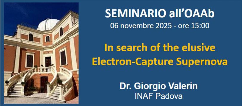 Giovedì 27 novembre alle ore 14:00, il Dott. Matteo Bezmalinovich (INAF – Osservatorio Astronomico d’Abruzzo, IT) terrà il seminario dal titolo “Modelling of early-stage kilonova ejecta opacity in the multi-messenger era: the selenium case”. Abstract: In the multi-messenger era, kilonovae (KNe) represent key sites of rapid (r-) neutron capture process nucleosynthesis. KNe are quasi-thermal electromagnetic […]