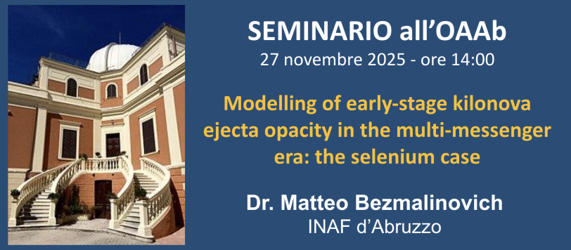 Giovedì 27 novembre alle ore 14:00, il Dott. Matteo Bezmalinovich (INAF – Osservatorio Astronomico d’Abruzzo, IT) terrà il seminario dal titolo “Modelling of early-stage kilonova ejecta opacity in the multi-messenger era: the selenium case”.