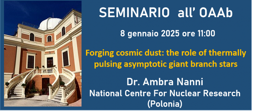Mercoledì 8 gennaio alle ore 11:00, la Dr. Ambra Nanni del National Centre For Nuclear Research (Polonia) terrà il seminario dal titolo “Forging cosmic dust: the role of thermally pulsing asymptotic giant branch stars“. Abstract Thermally pulsing asymptotic giant branch (TP-AGB) stars are among the Universe’s most prolific dust producers, enriching galaxies with metals partially […]